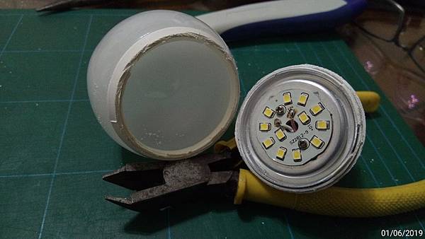 LED燈泡不亮了, 蠻想要留下那個半圓的燈罩, 本以為應該很好拆, 沒想到意外的難拆, 最後是用鋸子, 鋸開鋁座和燈罩相接處才拿下來....