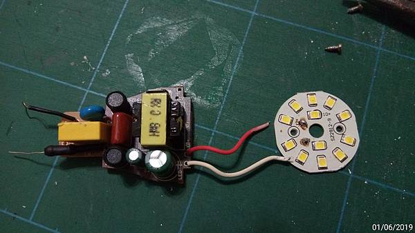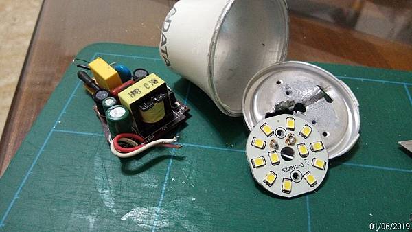 圖中可見變壓整流的電路板有焦黑的情形, LED的電路板上印著12V, 判斷LED應沒壞, 改天找個12V的電源接上試試!